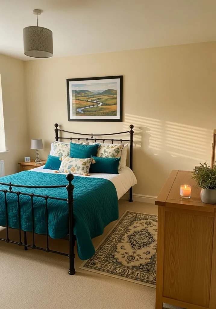 This bedroom design is the ultimate lesson in how to create a glowy, cozy sanctuary using a classic neutral palette. The walls are wrapped in a soft, buttery off-white that feels incredibly luminous when the afternoon sun peeks through the blinds. A black iron bed frame provides a sharp, traditional silhouette against the pale walls, while the vibrant teal bedding and patterned accent pillows add a refreshing splash of jewel-toned energy. The light wood dresser and a flickering candle on the side create a grounded, lived-in feel that makes the whole room breathe with comfort.
