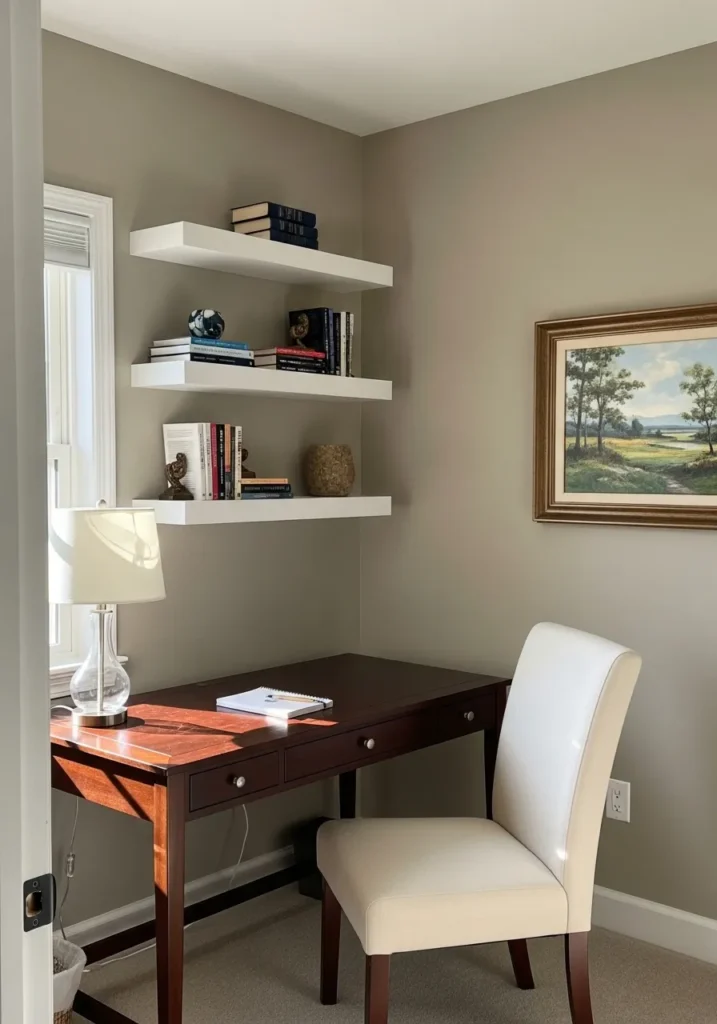 This workspace is a masterclass in how to use a perfect “greige” to create a professional yet warm environment. The walls are finished in a versatile, muddy gray that shifts beautifully with the natural light, making the white floating shelves look exceptionally crisp and clean. A dark wood desk anchors the corner with a bit of traditional weight, while the cream upholstered chair and glass lamp add light, modern touches. The framed landscape art brings in a touch of the outdoors, perfectly echoing the earthy undertones of the paint and creating a space that feels deeply intentional.