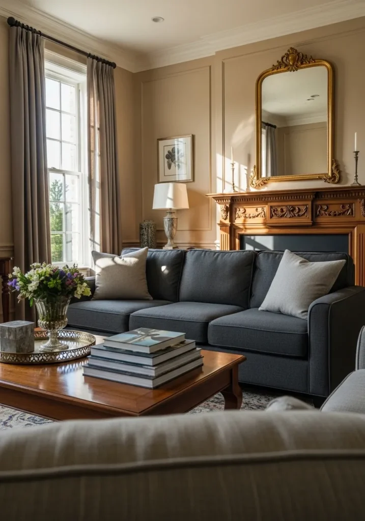 This formal sitting room is the epitome of classic grace with its perfectly paneled walls and warm, honey-toned wood accents. The walls are finished in a rich, toasted beige that creates a soft glow against the ornate wooden mantel and the gilded antique mirror. A structured charcoal sofa provides a sophisticated seat for guests, while the heavy taupe drapes and tiered coffee table books add layers of lived-in luxury. Every detail, from the fresh flowers to the brass candle holders, contributes to a space that feels deeply rooted in traditional design.