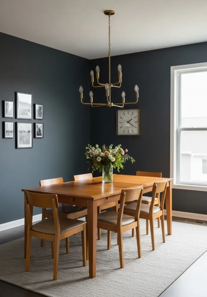 Talk about a major style statement! This dining room uses a deep charcoal on the walls to create a dramatic backdrop that makes every other element pop. The warm wood of the mid-century modern table and chairs glows against the dark paint, while the brass chandelier adds a hint of glam overhead. A crisp white window frame and a light grey rug keep the room from feeling too heavy and ensure the space remains balanced and airy.