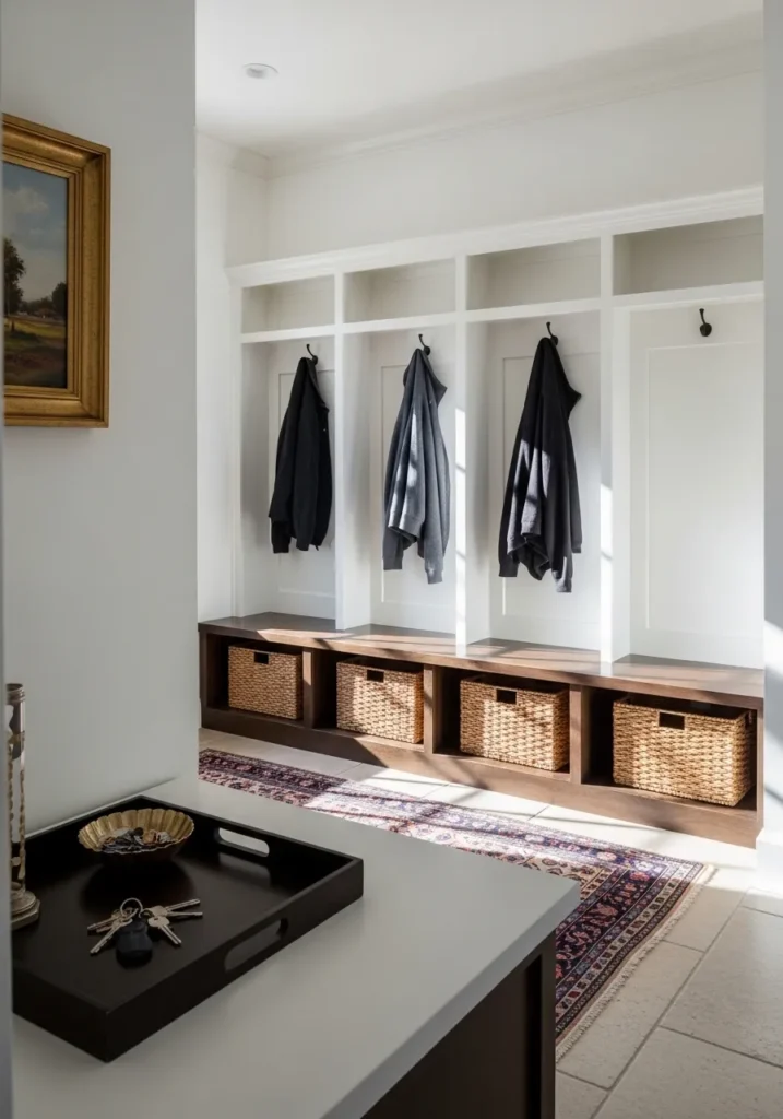 It is such a relief to see a mudroom that feels this serene and “put-together” rather than cluttered. Choosing a creamy, forgiving white for an entryway is a brilliant move because it keeps the space feeling airy while adding enough warmth to keep it from looking clinical. If you are looking to streamline your morning routine, a bright and cheerful landing zone like this is the perfect way to bring a sense of calm to the daily hustle. The way the light catches the white cabinetry makes the whole area feel fresh and ready for whatever the day brings.
