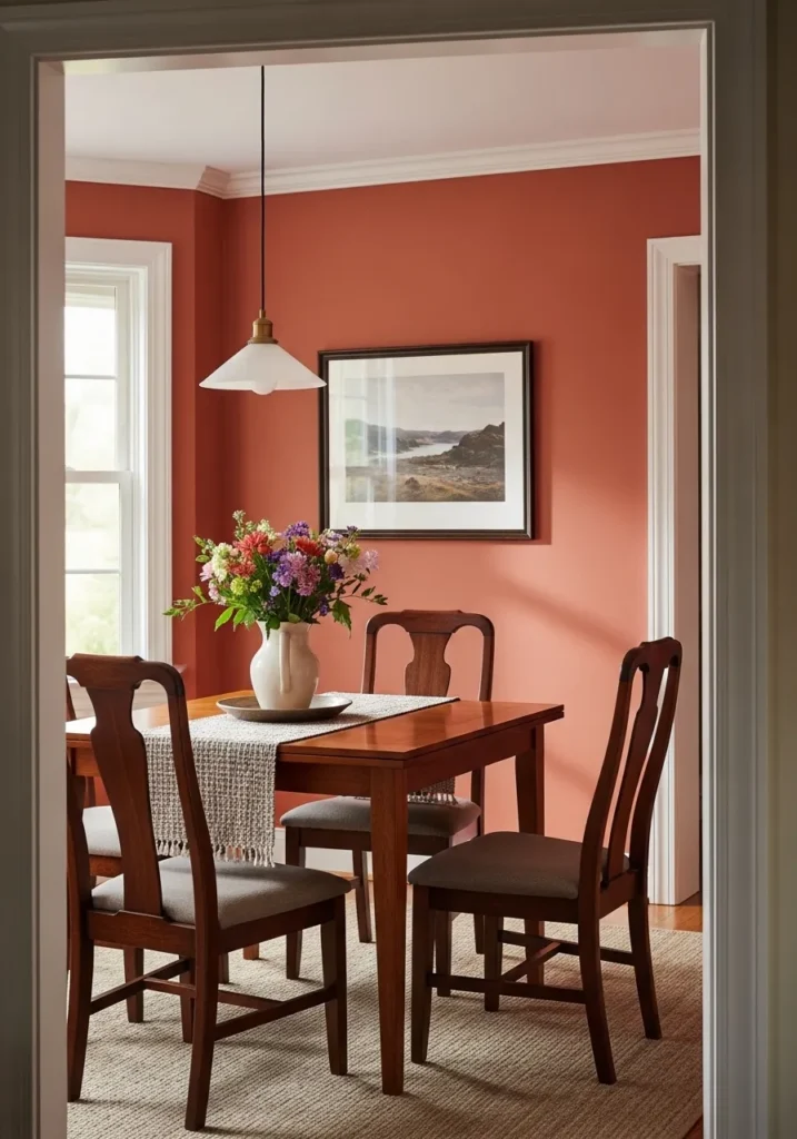 This dining room is a masterclass in using saturated, sun-baked tones to create a space that feels both historic and energetic. The walls are drenched in a rich terracotta that provides a stunning, high-contrast backdrop for the dark wood dining set and the crisp white window trim. A simple white pendant light hangs over the table, drawing the eye toward a vibrant bouquet of wildflowers and a serene framed landscape. The neutral area rug and natural light flooding in from the side keep the bold wall color feeling balanced and grounded rather than overwhelming.