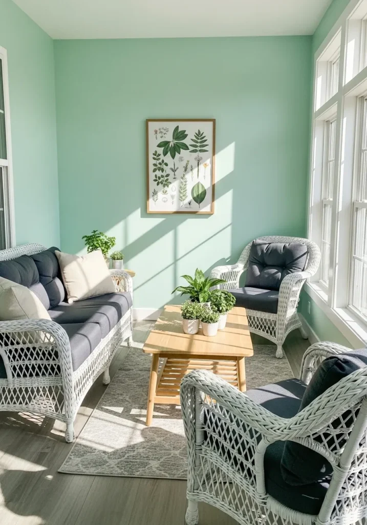 This sun-drenched enclosed porch is the ultimate example of how a refreshing, minty green can bring the feeling of a garden indoors. The walls are coated in a cheerful, pale seafoam that acts as a luminous backdrop for the white wicker furniture and its high-contrast charcoal cushions. A natural wood coffee table and a botanical specimen print emphasize the organic theme, while the large windows allow the light to bounce off the soft wall color, making the entire space feel expansive and breezy. It is a perfectly curated environment designed for slow mornings and relaxing afternoons.