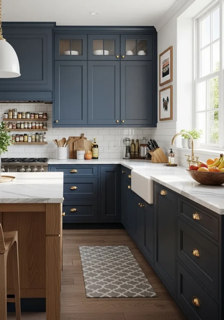 I am obsessed with how this navy blue makes the kitchen feel so much more expensive and custom. It is such a brilliant way to bring color into the heart of the home without it feeling overwhelming or too trendy. The mixture of the cool blue tones with the brass accents is honestly a match made in design heaven. If you want a kitchen that looks like it belongs on the cover of a magazine, this is definitely the color palette to steal for your own renovation.