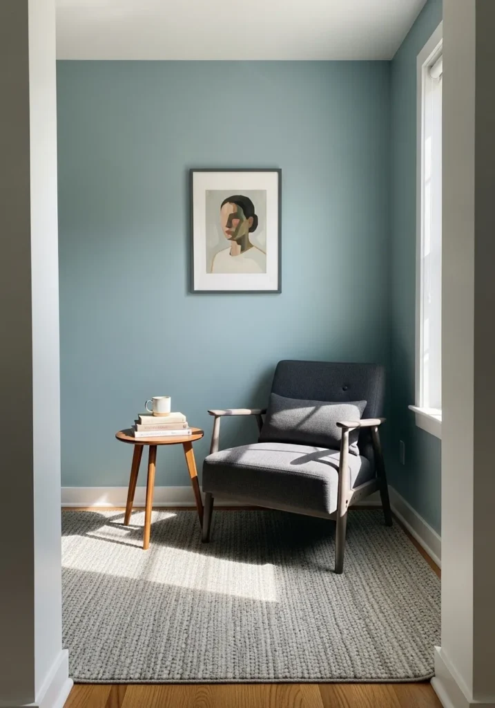 This charming little enclave is a masterclass in using cool tones to create a focused yet peaceful environment. The walls are finished in a soft, dusty denim blue that provides a gorgeous backdrop for the mid-century modern armchair and its matching charcoal pillow. A slender tripod side table holds a stack of books and a morning coffee, while the textured gray rug adds a layer of tactile comfort underfoot. The minimalist portrait on the wall perfectly captures the light, airy feel of the space, making it an ideal spot for quiet reflection or a long afternoon of reading.