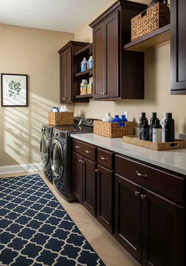 This laundry room setup proves that even the most functional spaces in your home deserve a little design love. The walls are coated in a classic, sandy beige that offers a warm backdrop for the rich, espresso-toned cabinetry. Woven seagrass baskets and a blue geometric runner add layers of texture and pattern, making the chore of folding clothes feel a lot less like work. With plenty of counter space and bright white surfaces, the room stays functional while maintaining a cozy, high-end aesthetic that ties in perfectly with the rest of a traditional home.