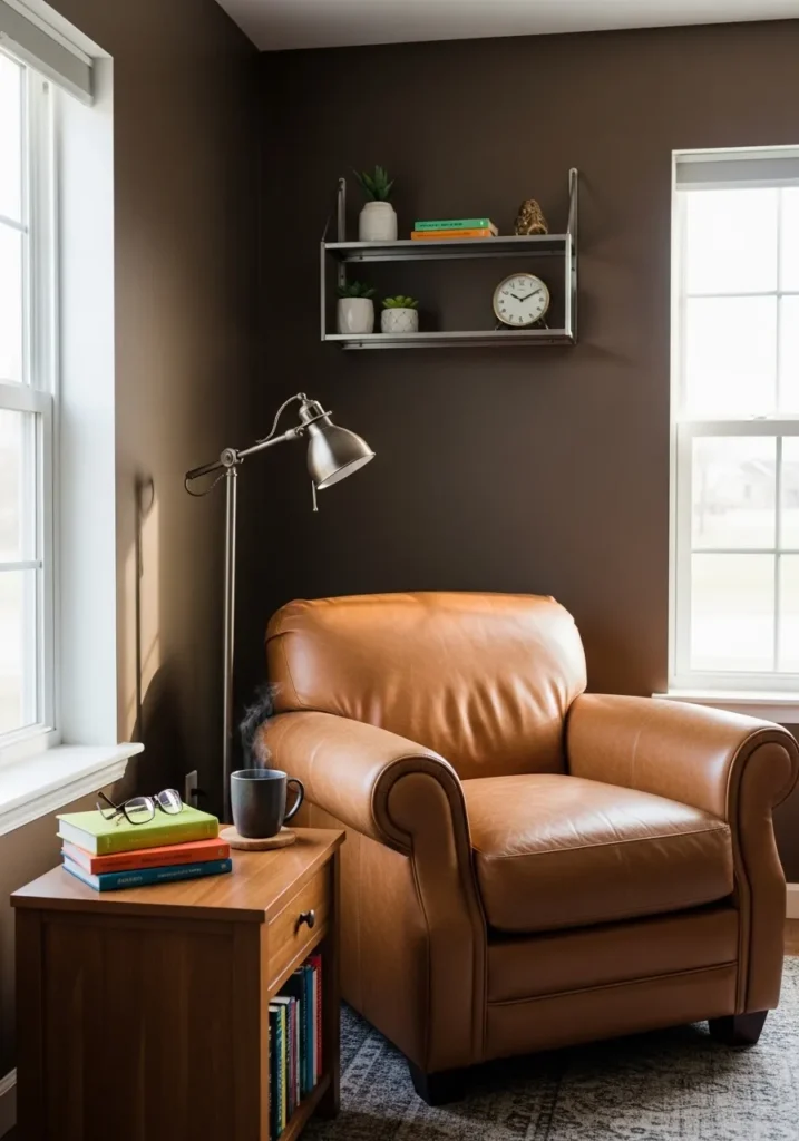 This cozy reading corner is a masterclass in using deep, earthy tones to create a sense of security and style. The walls are painted in a rich, dark bronze that borders on charcoal, providing a sophisticated backdrop for the cognac leather armchair. Natural light from the flanking windows catches the warmth in the paint, while a sleek industrial floor lamp and silver wall shelving add a modern, metallic edge. Small pops of color from the stacked books and tiny potted succulents keep the vibe from feeling too heavy, resulting in a perfectly balanced sanctuary for any bibliophile.