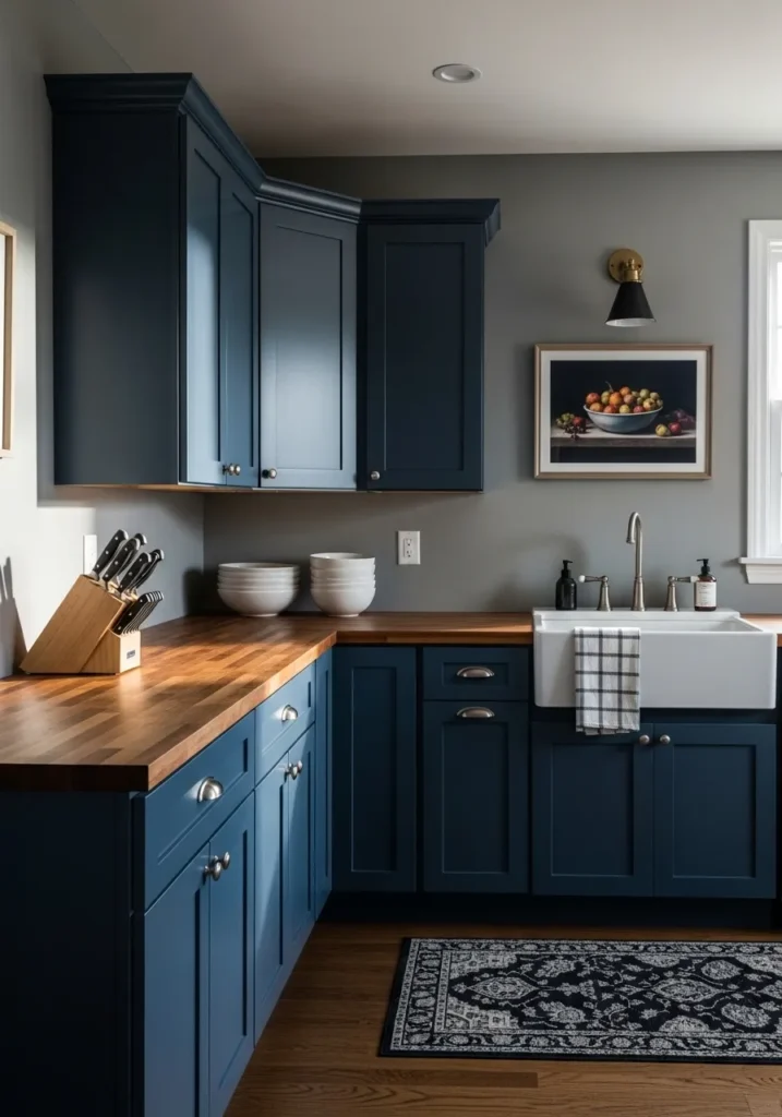 This kitchen layout is a masterclass in blending traditional charm with a modern, dramatic edge. The deep, stormy blue of the shaker-style cabinets creates a bold foundation that looks incredibly sharp against the soft gray walls. Butcher block countertops provide a necessary touch of organic warmth, while the classic white farmhouse sink and gooseneck faucet keep the workspace feeling bright and functional. A patterned vintage-style rug on the hardwood floor pulls the whole look together, adding a layer of cozy texture to the high-contrast design.