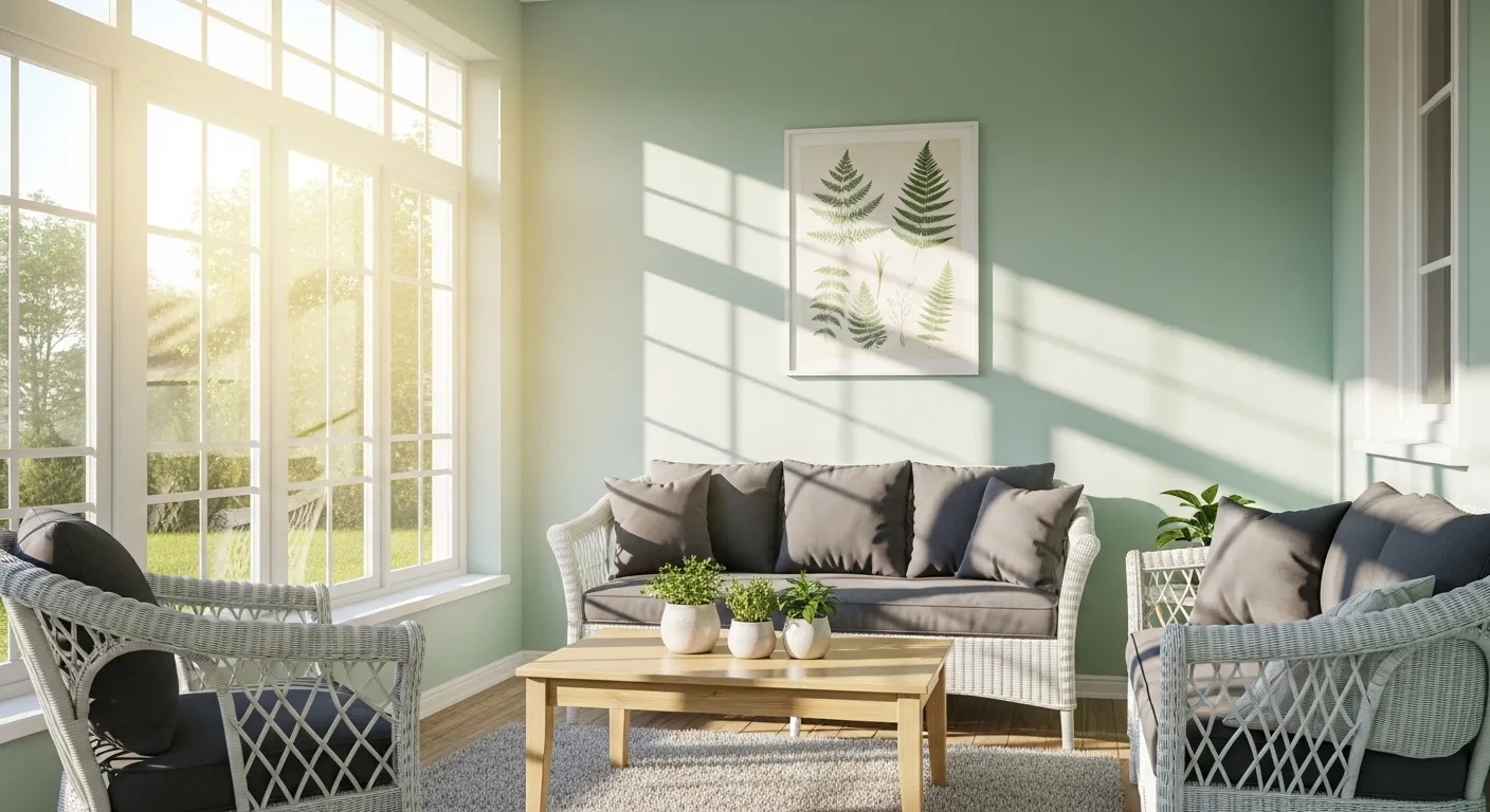 This sun-drenched enclosed porch is the ultimate example of how a refreshing, minty green can bring the feeling of a garden indoors. The walls are coated in a cheerful, pale seafoam that acts as a luminous backdrop for the white wicker furniture and its high-contrast charcoal cushions. A natural wood coffee table and a botanical specimen print emphasize the organic theme, while the large windows allow the light to bounce off the soft wall color, making the entire space feel expansive and breezy. It is a perfectly curated environment designed for slow mornings and relaxing afternoons.