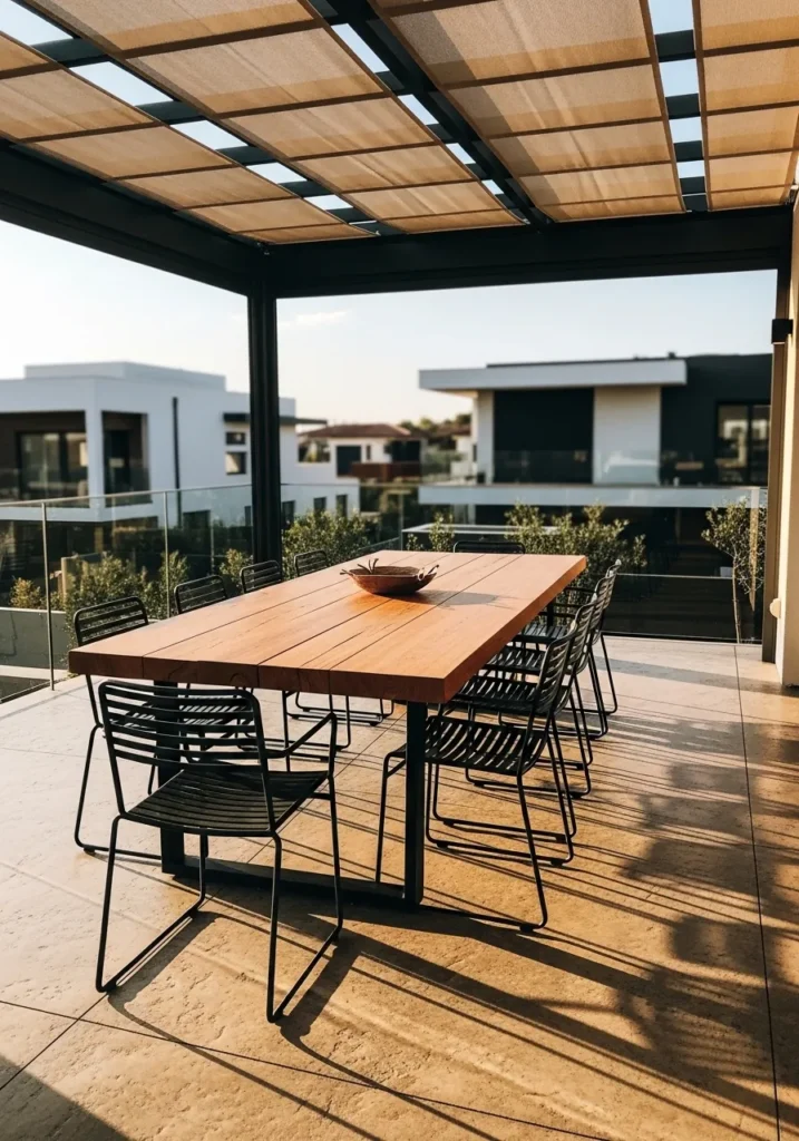 This large terrace features a sleek black pergola topped with woven panels that filter the sunlight beautifully across a long wooden dining table. Slim black chairs keep the look modern and airy, while the open railing allows uninterrupted views of neighboring rooftops. The flooring has a warm natural tone that softens the structured lines, and the entire setup feels open, breezy, and perfectly proportioned for hosting.