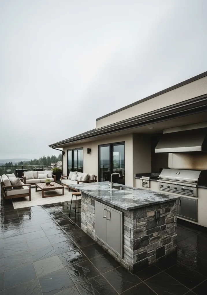 A fully equipped outdoor kitchen anchors this large terrace, complete with a substantial stone island and sleek grill area. The dark flooring contrasts beautifully with the lighter countertops, while additional lounge seating extends the entertaining potential. The layout feels cohesive and thoughtfully planned for gatherings.