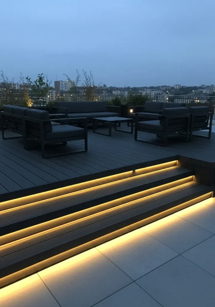 This terrace transforms after dark with integrated LED strip lighting built into wide steps that lead to an elevated lounge area. Deep toned seating contrasts against the glowing lines, and the city skyline sparkles in the distance. The layered levels give the space dimension and drama without clutter.