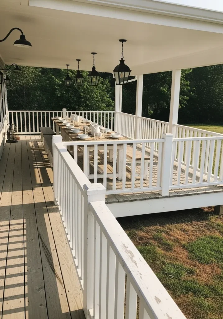This spacious terrace wraps around the home with crisp white railings and generous decking that instantly feels open and welcoming. A long outdoor dining table sits under a covered section with simple pendant lights, while the exposed side overlooks greenery below. The layout offers plenty of room to move around, making it perfect for hosting larger gatherings without ever feeling crowded.