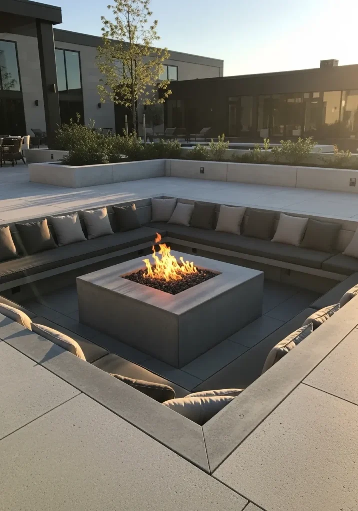 This large terrace centers around a sunken seating area with wraparound cushions and a sleek square fire feature. The clean concrete edges frame the lounge beautifully, and the elevated surroundings make the space feel intentional and cozy despite its size. The symmetry adds a modern touch while keeping everything comfortable.