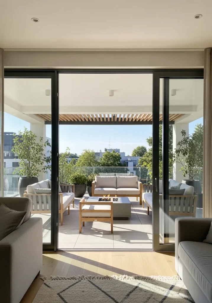 Floor to ceiling sliding doors open directly onto a generous terrace furnished with soft neutral seating and a wooden coffee table. The transition between interior and exterior feels seamless, with matching tones and textures that visually connect both spaces. Natural light pours through, highlighting the open layout.