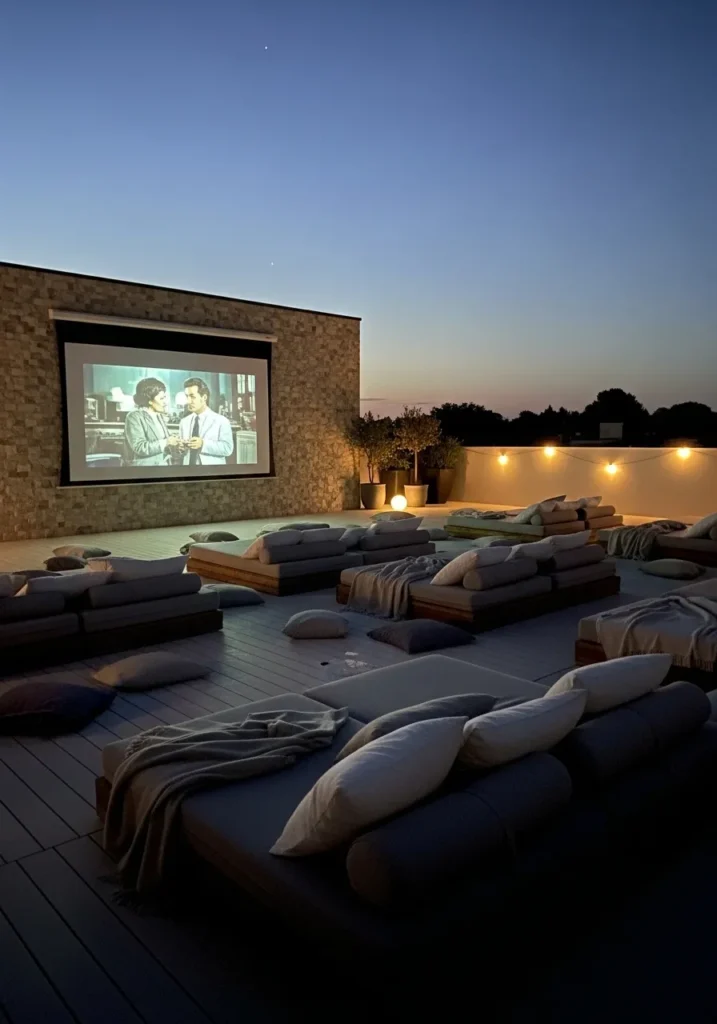 This terrace transforms into an outdoor movie lounge with a large screen mounted against a simple wall and rows of plush seating arranged to face it. Soft ambient lighting glows around the edges, creating a cozy setting without overpowering the night sky. The open surroundings make it feel like a private rooftop retreat.