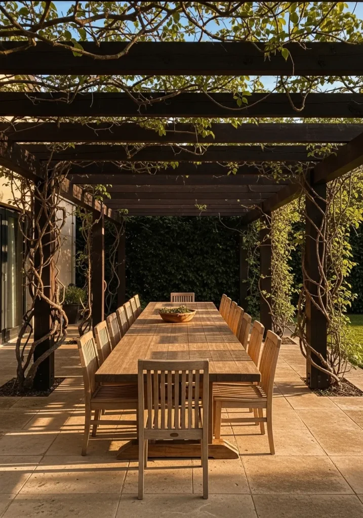 A wooden pergola stretches over a long dining table, with climbing plants weaving through the beams and casting patterned shadows below. The natural wood tones pair beautifully with the greenery, and the layout leaves ample space around the table for movement and comfort. The setting feels lush yet structured.