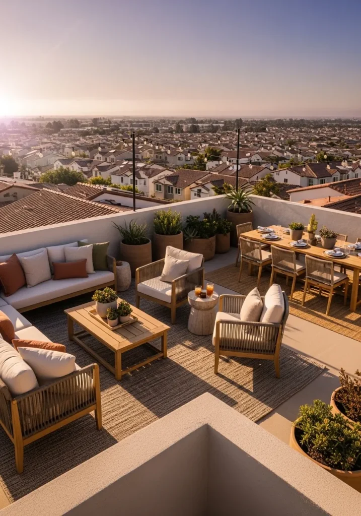 This expansive rooftop terrace is divided into cozy seating clusters with woven chairs, low tables, and built in benches. Warm sunset light washes over the space, highlighting the different levels and materials. The panoramic city view stretches beyond, making the terrace feel even larger.