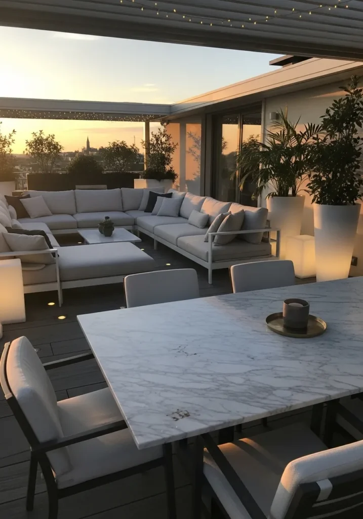 Evening terraces like this always capture my heart. The soft lighting makes everything feel intimate and elevated at the same time. It is the kind of space I would look forward to using every single night.