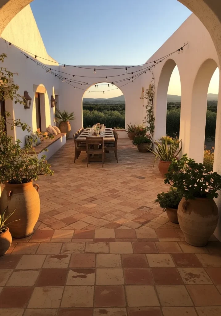 Warm terracotta tiles, soft cream arches, and oversized clay pots filled with greenery give this terrace a romantic Mediterranean charm. A long wooden dining table sits beneath delicate string lights, framed by repeated archways that guide the eye toward the open landscape beyond. The earthy tones and textured surfaces create depth without overwhelming the space.
