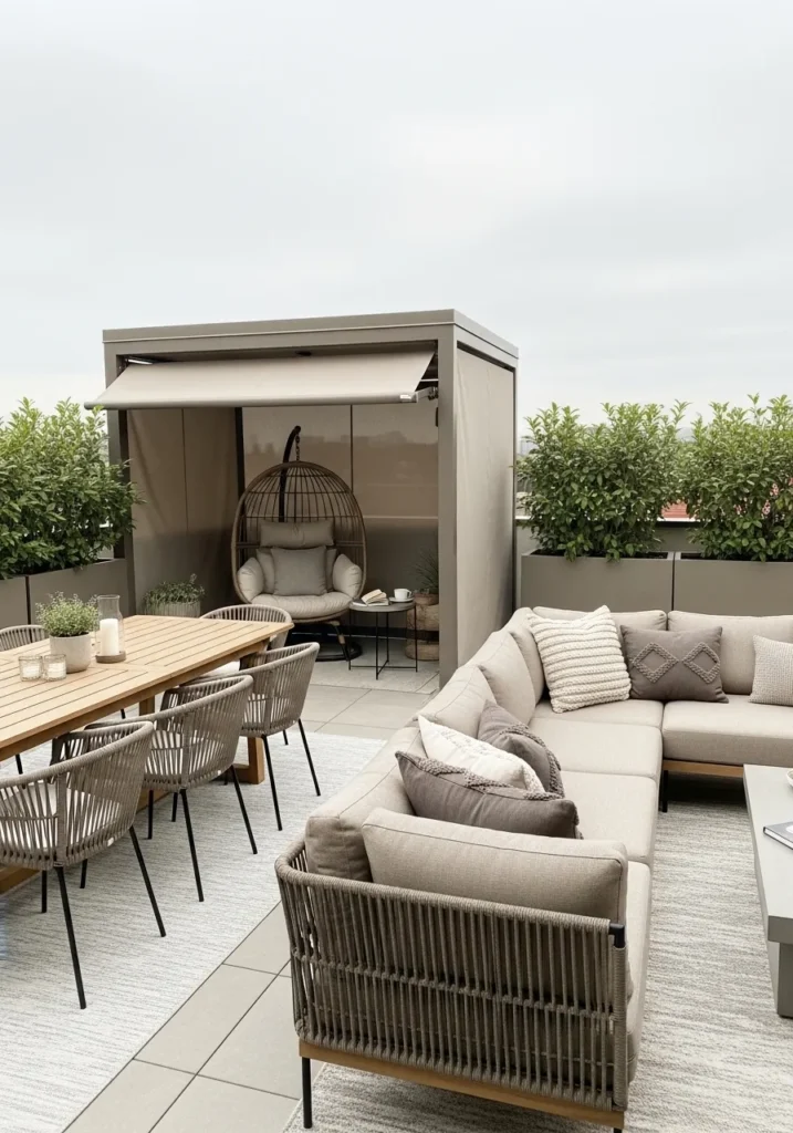 Here we see a spacious terrace layered with plush neutral seating, woven armchairs, and a generous sectional tucked into the corner. Pale flooring keeps everything light, while subtle greenery in planters adds softness around the edges. A covered nook in the background creates a second lounging zone, making the layout feel thoughtfully divided without closing anything off.