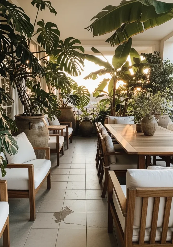 This terrace embraces greenery with large leafy plants framing a long wooden dining table. Light toned chairs and soft cushions balance the rich plant life, while the open city view keeps the space feeling expansive. The natural materials and layered textures create warmth against the sleek terrace structure.