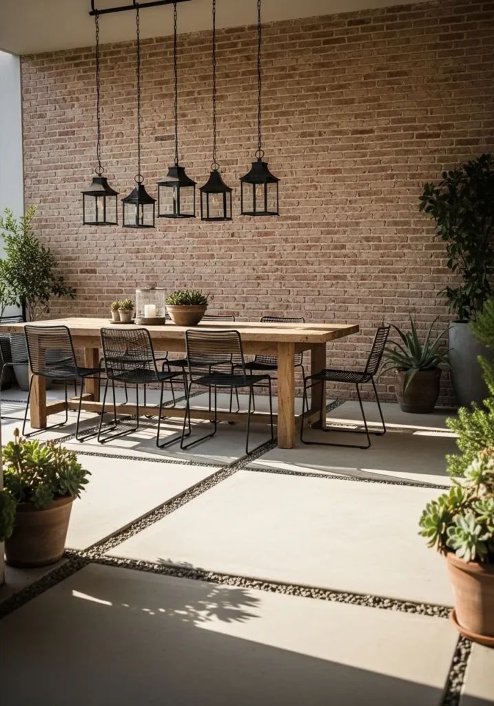 This terrace pairs a textured brick wall with smooth flooring and a substantial wooden dining table beneath a row of statement lanterns. The space is framed by potted plants that soften the structured lines, while the open layout keeps it feeling generous and uncluttered. The mix of materials adds depth and character.