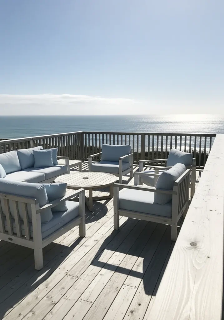 This wide open terrace features pale decking, light toned outdoor sofas, and simple railing that keeps the horizon fully visible. The furniture is arranged to encourage conversation while still allowing plenty of movement throughout the space. Everything feels airy and sun washed.