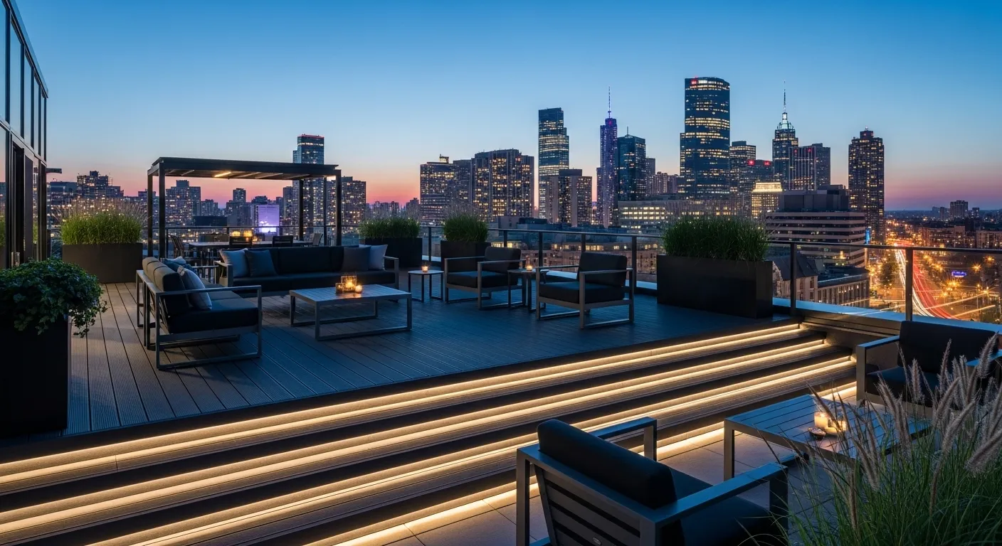 This terrace transforms after dark with integrated LED strip lighting built into wide steps that lead to an elevated lounge area. Deep toned seating contrasts against the glowing lines, and the city skyline sparkles in the distance. The layered levels give the space dimension and drama without clutter.