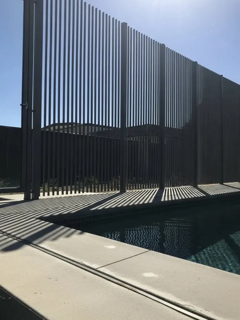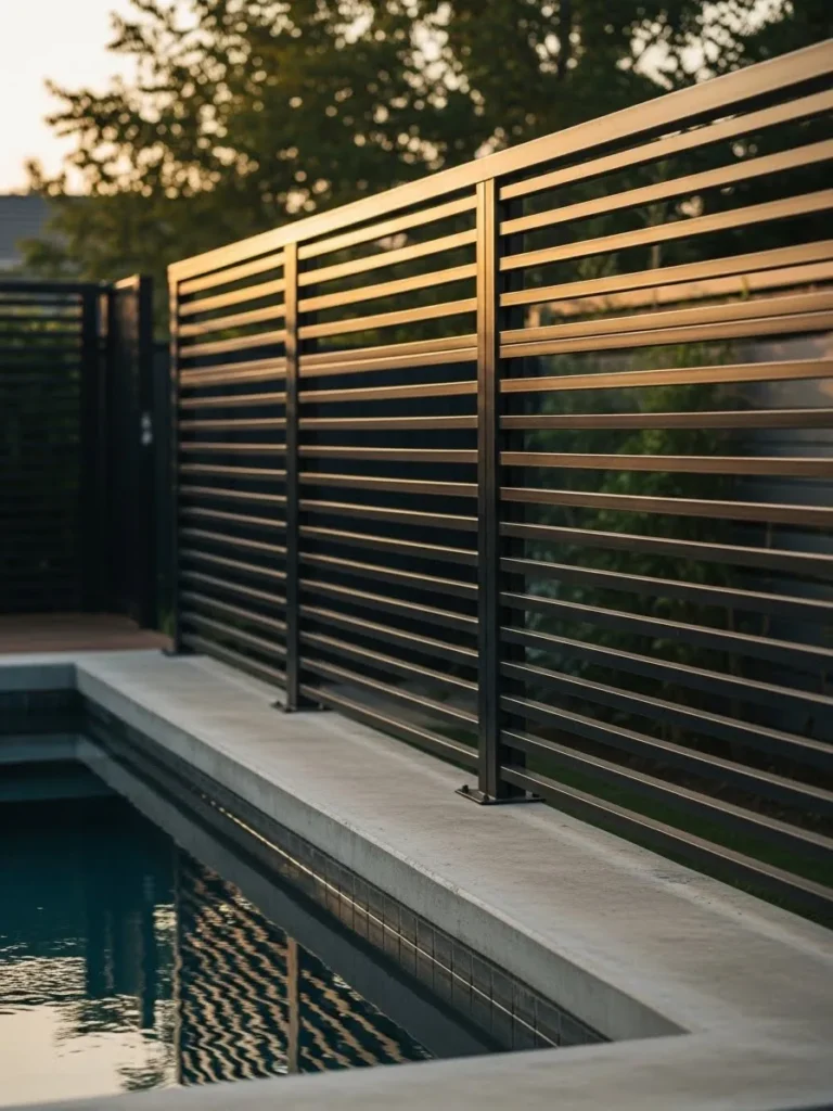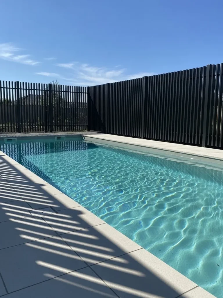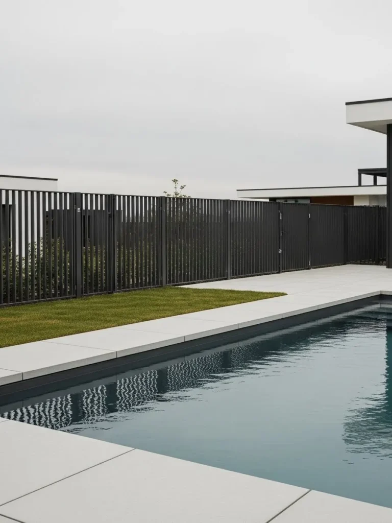 This pool fence stands out with tall black vertical slats that create strong shadows across the deck and water. The fence feels architectural and intentional, almost like part of the home itself. It offers privacy while still letting light filter through in a really striking way.