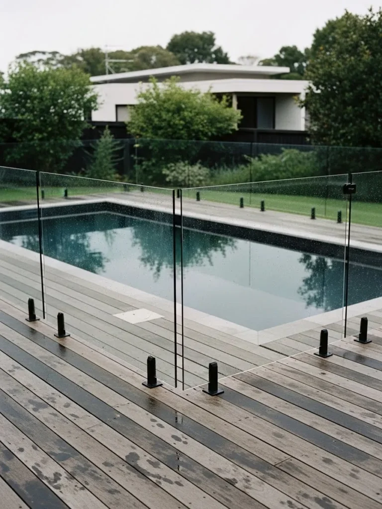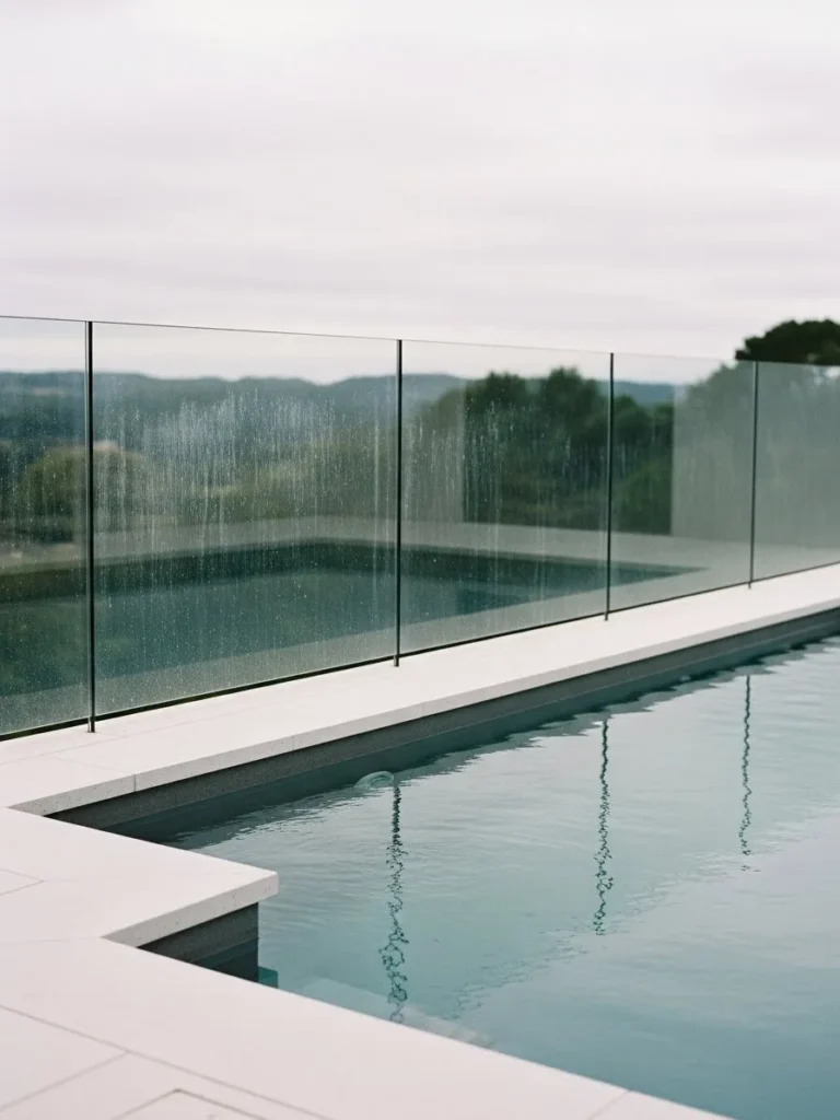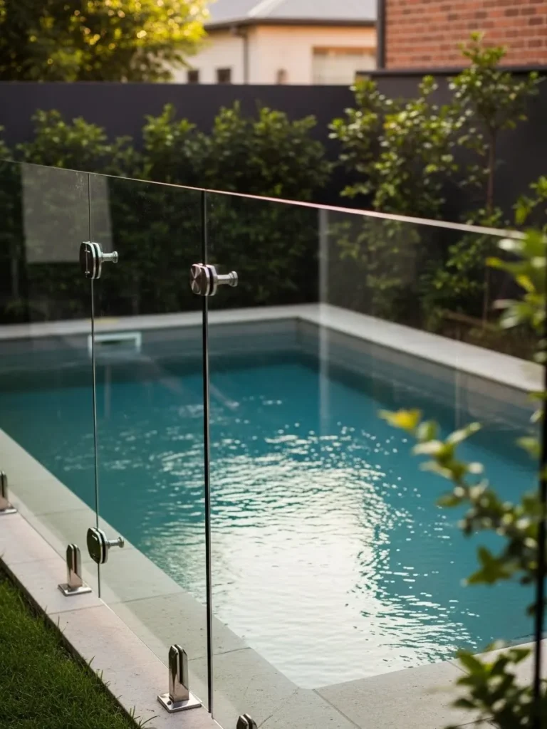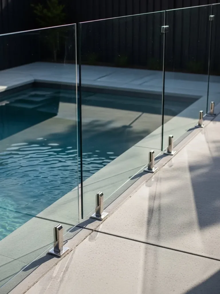 This pool fence uses clear glass panels supported by small metal fixtures set neatly along the pool edge. The design keeps the focus on the water while still defining the pool area clearly. Soft reflections in the glass add depth without cluttering the view.