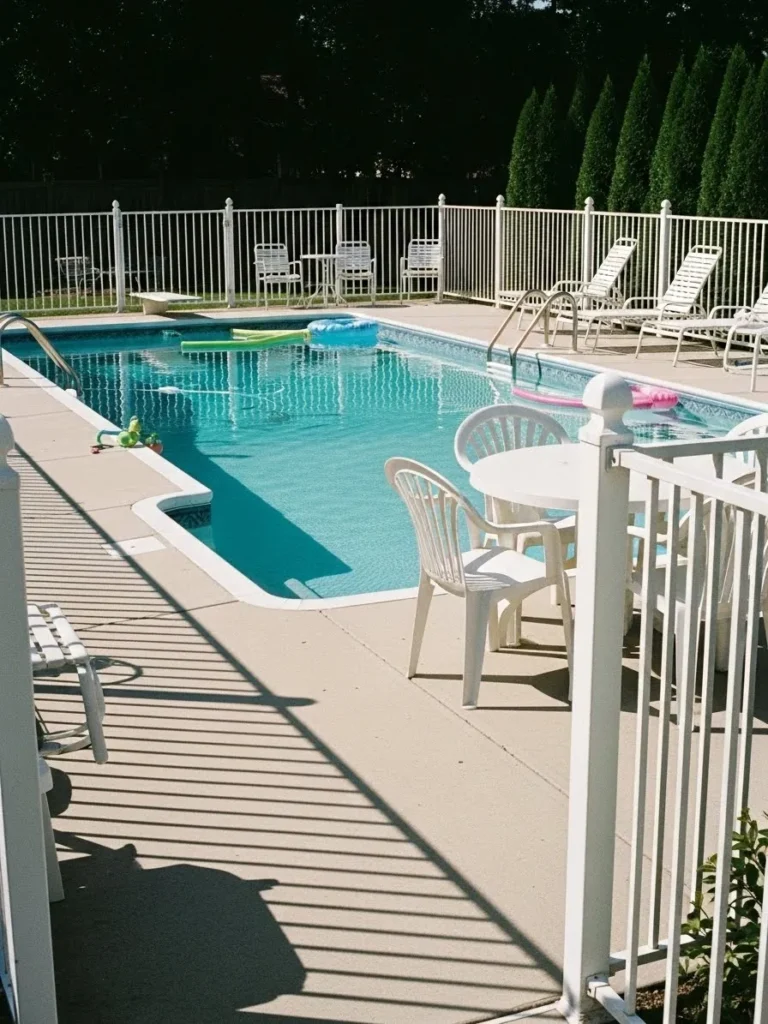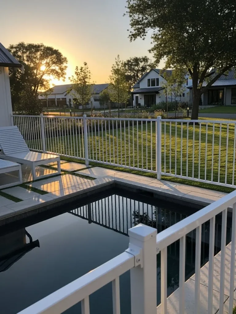 This pool setup features a white rail fence that wraps gently around the water, keeping the space secure while still feeling open. The evenly spaced vertical rails allow clear sightlines toward the yard and neighboring homes, which gives the pool area an airy and relaxed feel. Soft evening light reflects off the water and fence, adding warmth and a calm neighborhood charm.