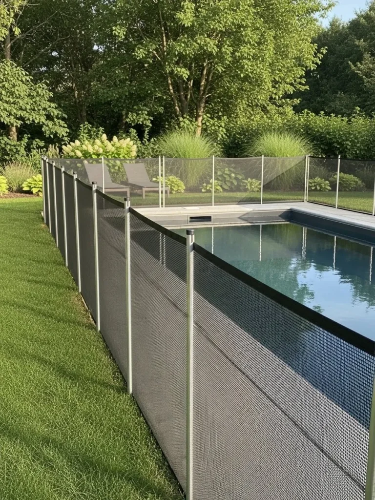This pool is bordered by a slim mesh fence framed in dark metal, creating a secure boundary that still feels light and open. The fence runs neatly along the pool edge and blends easily into the surrounding lawn and greenery. It feels practical and understated, letting the calm water and garden setting take center stage.