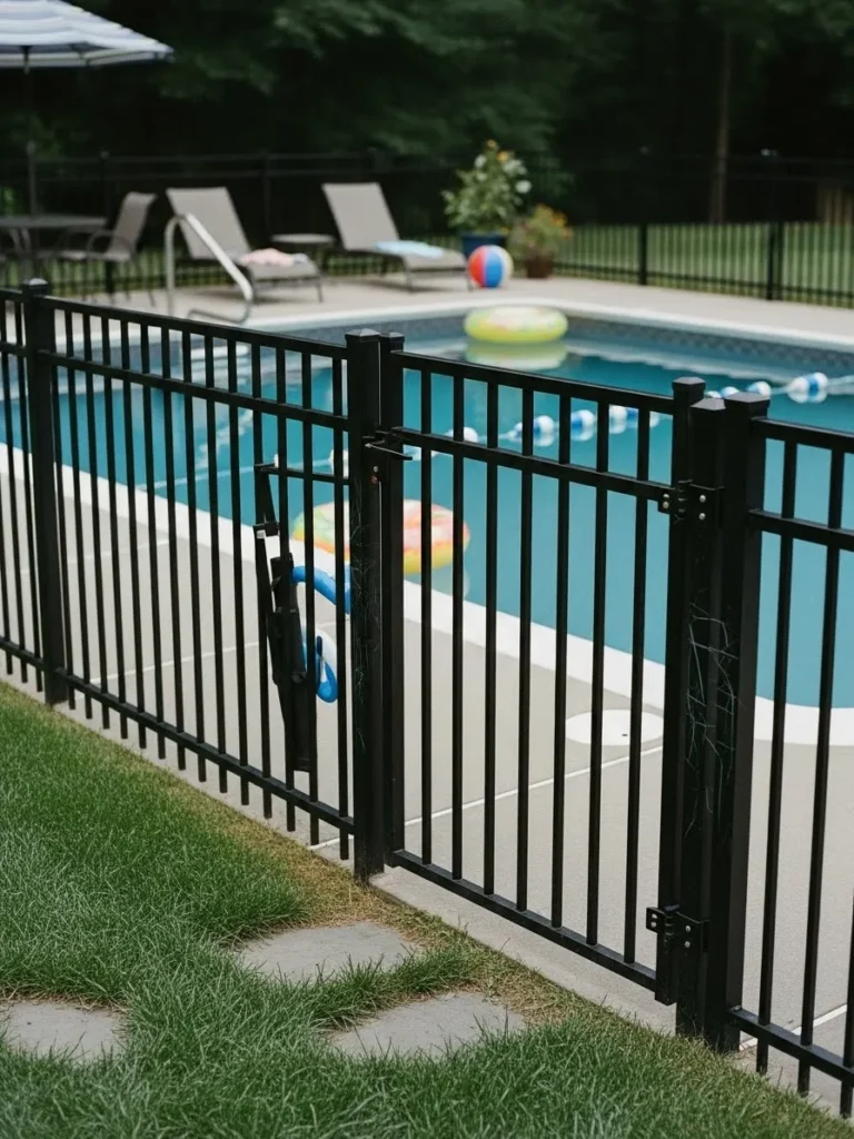This pool area features a black metal fence with vertical bars and a simple gate for easy access. The fence surrounds the pool evenly and pairs nicely with the bright water and green lawn. It feels familiar, sturdy, and well suited for an active backyard.