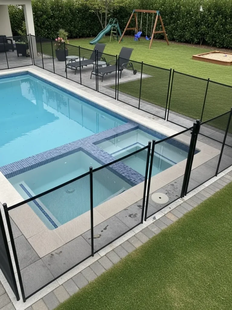 This pool fence combines a black metal frame with mesh panels that keep the area secure without blocking views. The low profile design blends into the yard and works well alongside modern paving and green lawn areas. It feels lightweight but still clearly does its job.