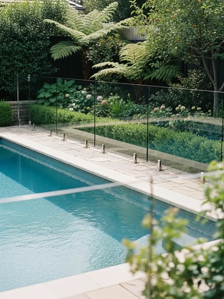 Here the pool is bordered by a frameless glass fence that sits lightly against lush plants and trees. The clear panels allow the greenery to remain the star while keeping the pool area safe and defined. Slim metal fixtures anchor the glass without disrupting the natural flow of the space.