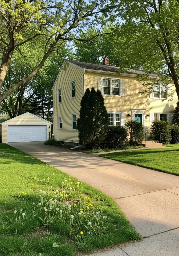 This looks like a soft sunny yellow, and I’d place it close to Benjamin Moore Hawthorne Yellow, just slightly lightened. It sits in that easy middle range where the color feels cheerful but not too strong. On a simple two-story home with white trim and a small garage, it feels familiar and comfortable.