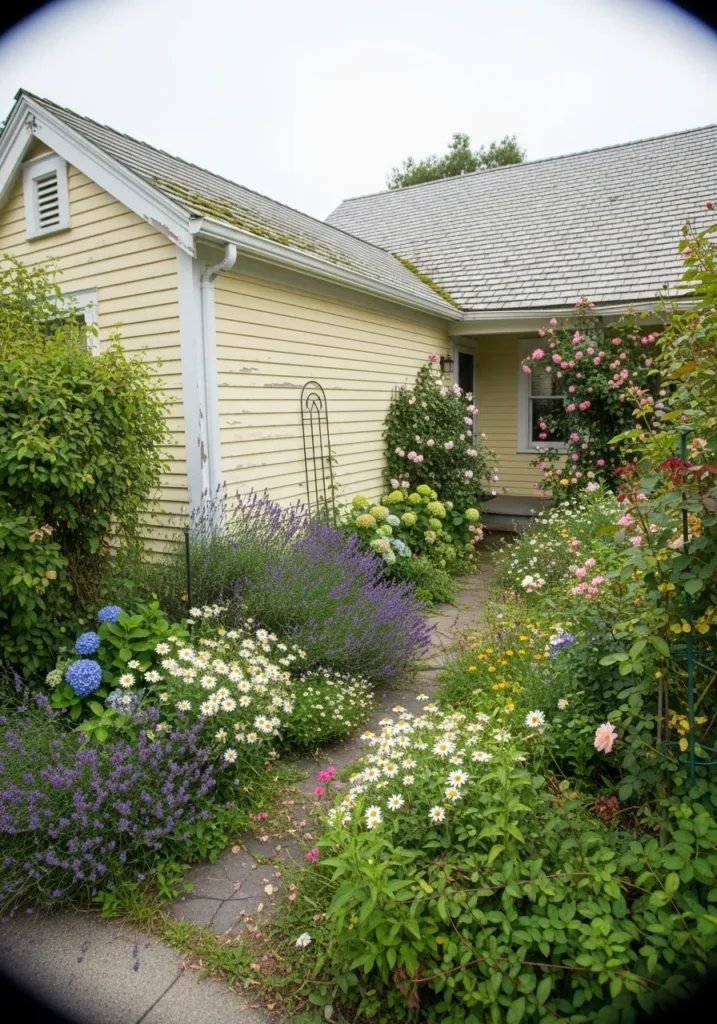 This reads like a pale, slightly creamy yellow, and it feels closest to Benjamin Moore Weston Flax. It is a softer yellow, not too bright, with a gentle tone that works well on siding. Next to all that greenery and flowers, it stays calm and doesn’t try to compete.