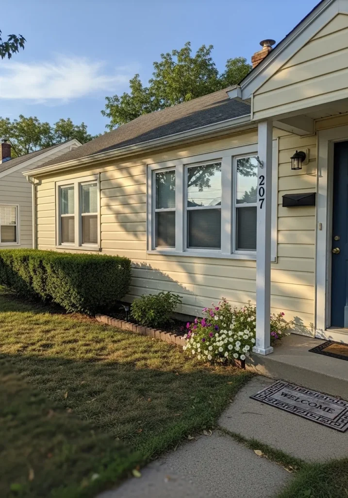 This looks very close to a soft butter yellow, and I’d place it near Benjamin Moore Hawthorne Yellow. It sits right in that warm, classic yellow range that feels cheerful without being loud. On a small house like this, especially with simple white trim and a front porch, it gives the whole place a friendly, easygoing feel.