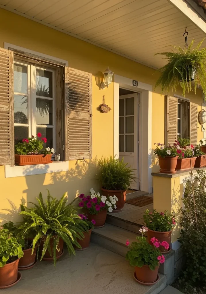 This reads like a deeper golden yellow, and it feels closest to Benjamin Moore York Harbor Yellow. It is richer than a pale butter tone, with more depth and a slightly sunbaked look. On a stucco wall like this, especially next to natural wood shutters and terracotta pots, it comes across warm and settled rather than bright.