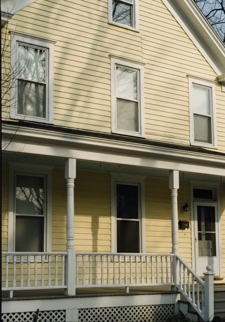 The undertone leans warm but slightly muted, which helps it sit nicely against crisp white railings and window frames. It can shift a little depending on light, reading brighter in open sun and more subdued in shade. I think it works best on classic siding like this, especially when you keep the rest of the palette simple and not too sharp.