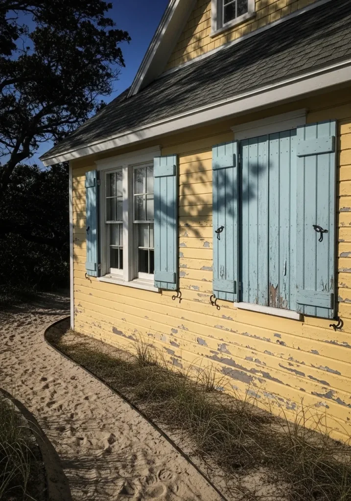 The undertone leans warm and a little dusty, which helps it sit nicely next to muted tones like those pale blue shutters. It does not stay bright, and that is part of the appeal. If you want this kind of look, it works best when you avoid crisp, high-contrast finishes and let things feel a bit softened and worn.