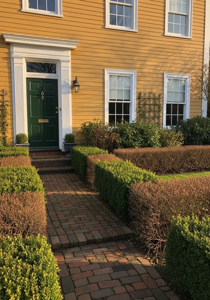 The undertone leans warm with a gentle golden base, which helps it read clean without turning sharp. It works well with fresh greenery and classic white details, and it tends to brighten up even a basic exterior. I would keep the rest of the palette simple so the yellow can stay relaxed and not feel busy.