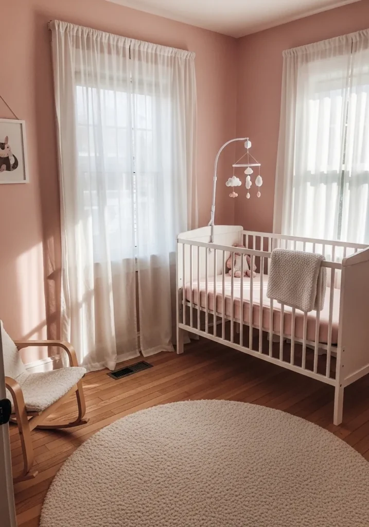 This reads as a gentle blush pink, and it looks very close to Benjamin Moore First Light. It sits right between pink and beige, so it never feels too sugary. On a nursery wall like this, it comes across calm and easy to live with, especially next to a simple white crib.