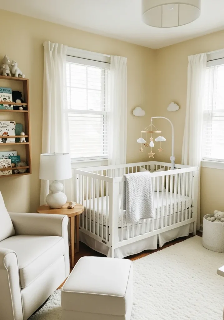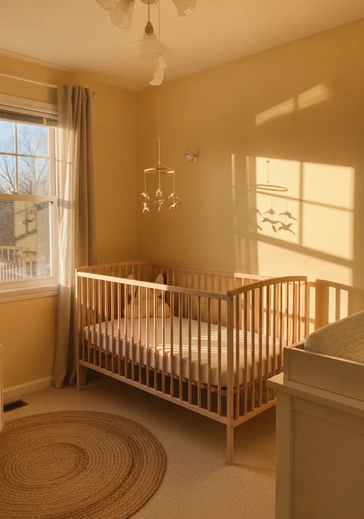 This looks like a soft creamy yellow, and it feels closest to Benjamin Moore Weston Flax. It’s a light yellow with a beige base, so it reads calm instead of bright. In a nursery, it feels warm and easy to live with, especially with white furniture like the crib .
