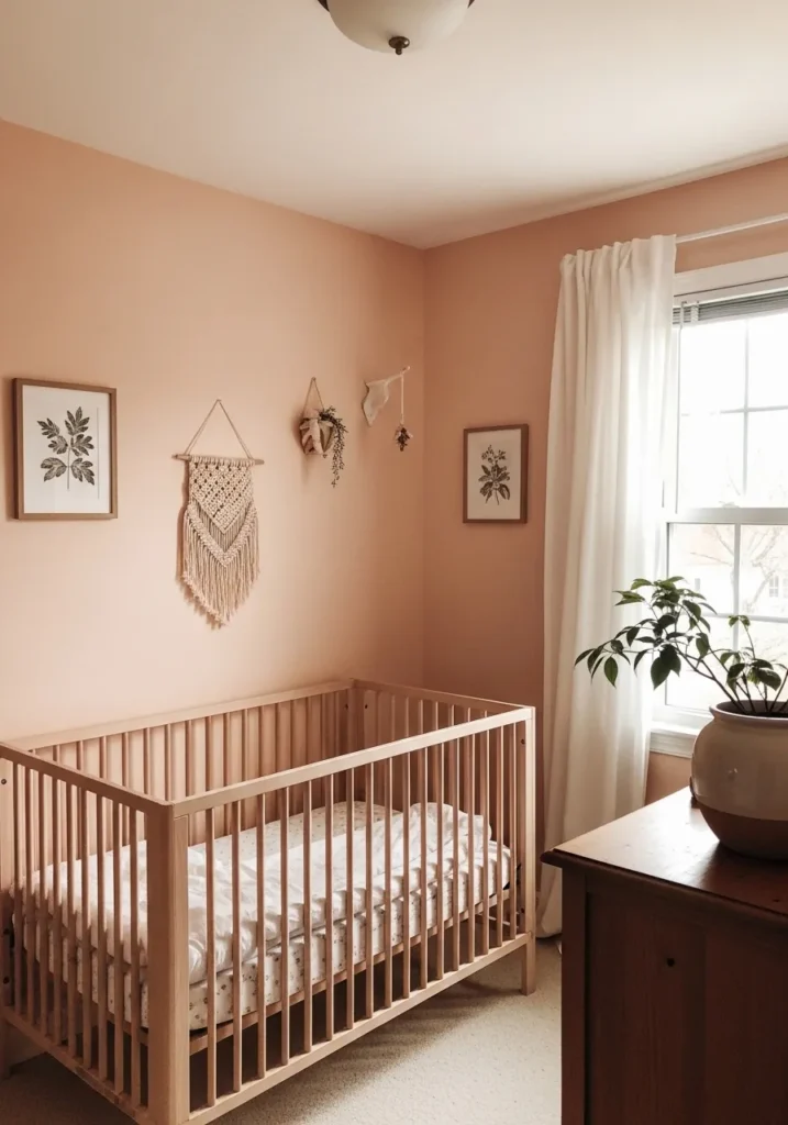 This looks like a soft peachy pink, and it feels closest to Benjamin Moore Pink Damask. It’s a warm pink with a touch of orange in it, so it leans more peach than blush. In a nursery, it feels gentle but still a little lively, especially with light wood furniture and simple wall decor.