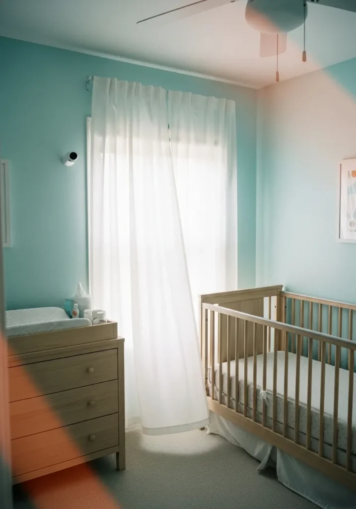 This looks like a soft aqua blue, and it feels closest to Benjamin Moore Palladian Blue. It sits between blue and green, with a light, airy quality that feels easy in a nursery. Next to the white crib and curtains, it reads clean but still gentle.