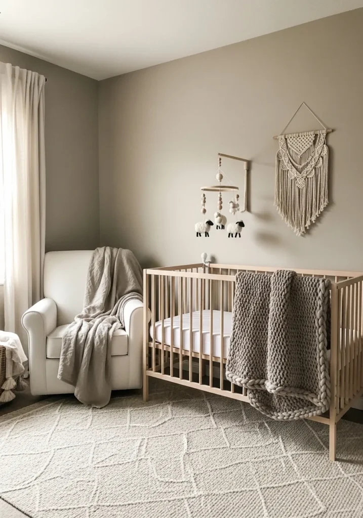 This looks like a light warm gray, and it feels closest to Benjamin Moore Balboa Mist. It’s one of those in-between shades that sits right on the edge of gray and beige, so it never feels cold. In a nursery, it reads soft and steady, especially next to pale wood furniture and simple upholstery.