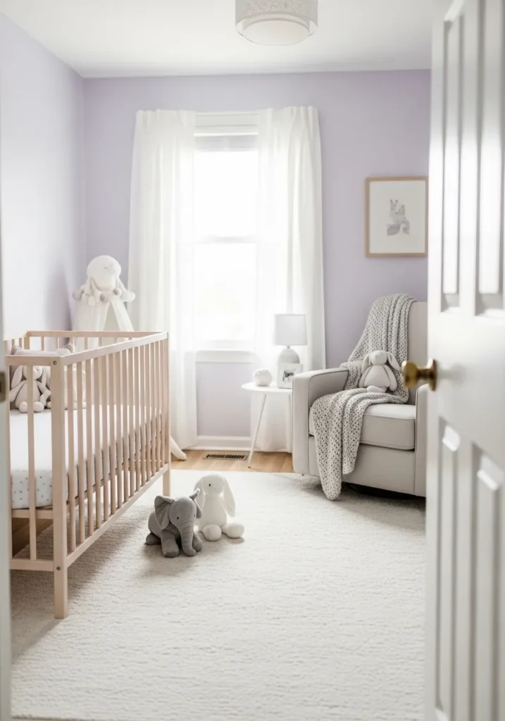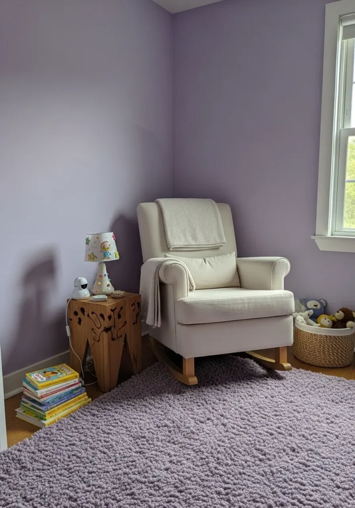This looks like a soft lavender, and it comes across very close to Benjamin Moore French Lilac. It’s a muted purple with a bit of gray in it, which keeps it from feeling too bright or childish. In a nursery, it feels gentle and a little cozy, especially next to a simple chair and soft rug like this.