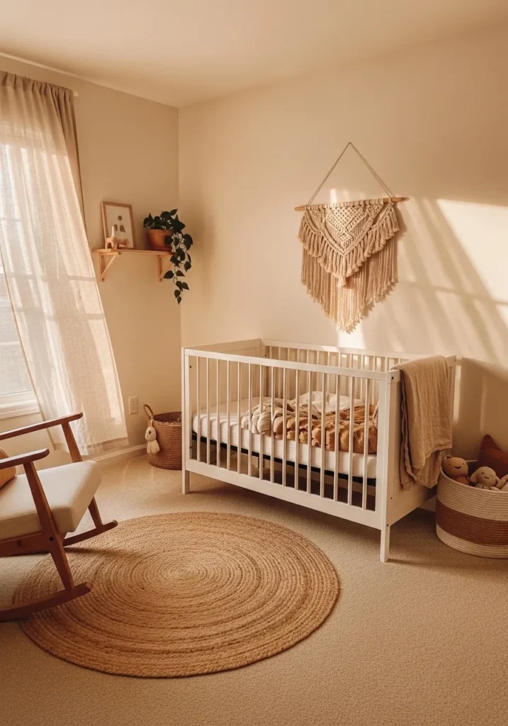 This looks like a warm creamy beige, and it feels closest to Benjamin Moore Navajo White. It’s a soft, light neutral with a noticeable yellow undertone, which gives it that warm, sunlit feel without being too strong. In a nursery, it reads cozy and relaxed, especially with a white crib and natural textures nearby.